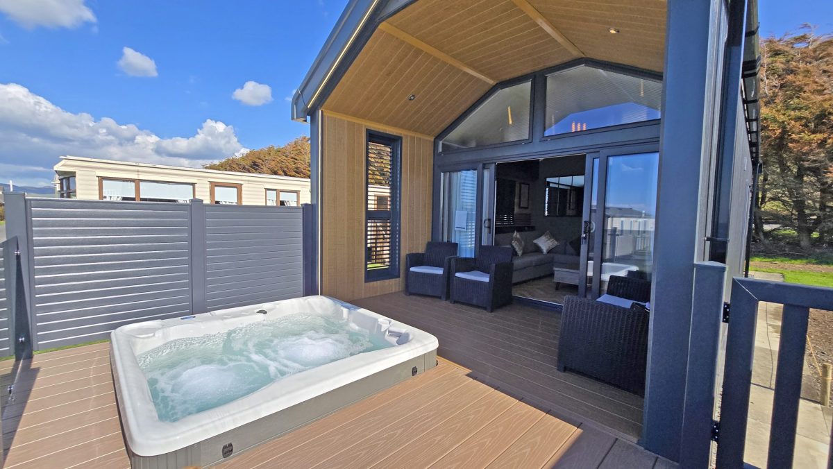 Open plan living area with patio doors leading out to decking with outdoor hot tub. Bed linen provided.